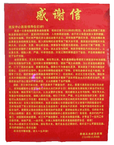 21点玩法研究所 领导你们好: 我是一位患有脑梗塞患者的家属,我的父亲于2010年的9月2日,自山西大同第三21点游戏规则 转至贵院进行治疗,直至9月26日出院。 ![]() 入住贵院的初期,由于我父亲是左脑大面积梗塞,右侧身体偏瘫,同时又严重的消化道出血情况发生,并伴随着严重的失语,无法准确的表达患者自身的病情及病史,给入院初期的诊察带来了极大的不便 。贵院接诊的神经内科张琳大夫,以认真、负责、耐心的态度,凭借多年的医患沟通经验,及时的了解了病情,为当日的会诊提供了准确的信息。当日,凭借着王主任与张琳、韩彩萍等神经内科的大夫们认真负责、细致入微、严谨、科学的态度,对我父亲的病情进行了会诊,并及时准确的制定了治疗方案。 在住院期间,王主任与张琳、韩彩萍大夫,每天查房都会根据我父亲逐渐好转的病情,及时地调整治疗方案,这对我父亲病情的稳定,提供了有力的保障,为以后出院的康复治疗,打下了坚实的基础,更重要的是:我们作为患者的家属,更加坚定了为我父亲治疗的信心。在治疗的过程中,我父亲的病情迅速好转,右侧的身体由彻底不能动变得有了反应,他的情绪也由焦躁变得平和了。在这期间,王主任与张琳、韩彩萍大夫对病情的耐心讲解和指导,我们患者家属才懂得了该如何配合大夫对患者的治疗,使得药物治疗与心理治疗齐头并进,大大的提高了治疗效果 目前,我父亲已经出院,并已展开了康复治疗。在此,我谨代表我的父亲及我的家人,深深的感谢中心21点游戏规则 神经内科的大夫们和护士们!特别感谢负责给我父亲治疗的王主任与张琳、韩彩萍大夫,以及主管护士张培。我们感谢王主任与张琳、韩彩萍大夫凭借多年的临床经验,细致入微观察,制定了科学、严谨、行之有效的治疗方案!感谢他们认真负责的工作态度!感谢他们,在我父亲住院期间的关怀和照顾!我们尤其要感谢张琳大夫!在我父亲住院期间,她多次语重心长的建议我们为父亲做不同的检查治疗,及时地治疗了我父亲的消化道出血及肠道息肉!感谢她不厌其烦、和蔼可亲的劝说我父亲配合治疗,使得我父亲在住院治疗期间的疗效显著!感谢她在我父亲出院后,仍然给予我们热心的帮助!最后,我们深深地感谢中心21点游戏规则 的领导们!我相信,是你们的严于律己,对21点游戏规则 科学的管理、对工作严格的要求、对医术的精益求精,才带出了一支对工作尽职尽责、科学严谨、一丝不苟,对病人和蔼可亲医术高超的医疗队伍。谢谢! 我从内心感激王主任与张琳、韩彩萍大夫,我们会永远记得你们。我们没什么可留在这里,我们把感激的心留在这里! 祝你们万事如意,好人一生平安! 患者王兆新及家属 2010-10-08 |