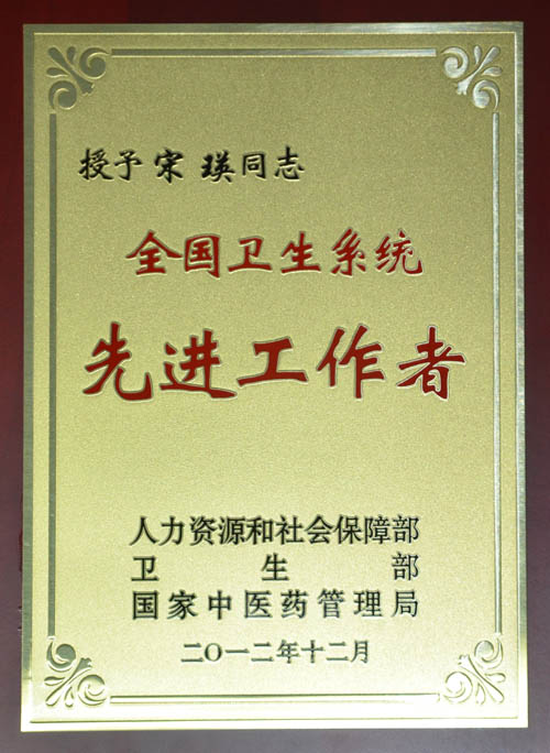 1月7日,在全国卫生工作会议上,国家人力资源社会保障部、卫生部、国家中医药管理局联合下发了《关于表彰全国卫生系统先进集体、先进工作者及白求恩奖章获得者的决定》(人社部发〔2012〕96号 ),我院消化科宋瑛主任被授予“全国卫生系统先进工作者”荣誉称号。